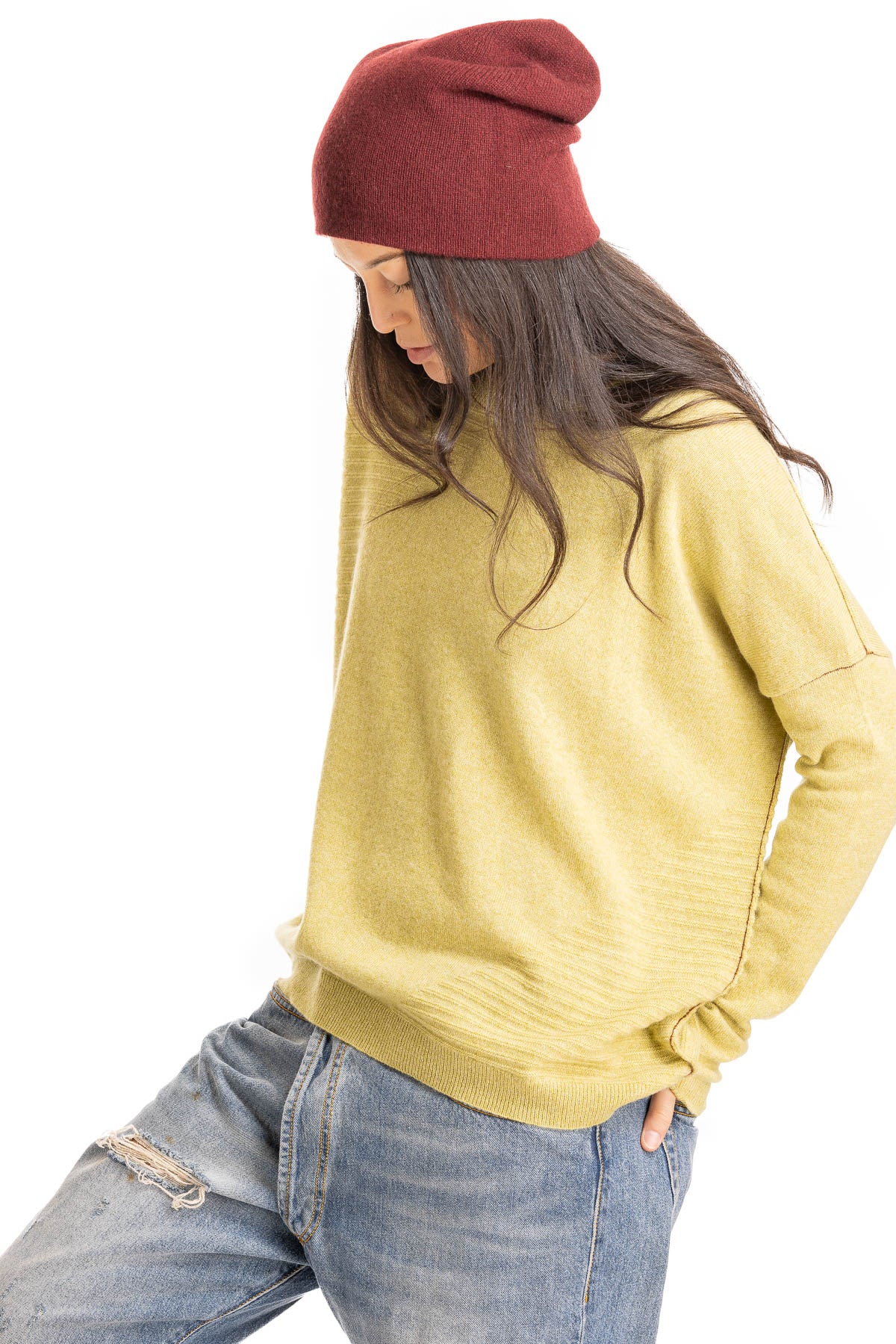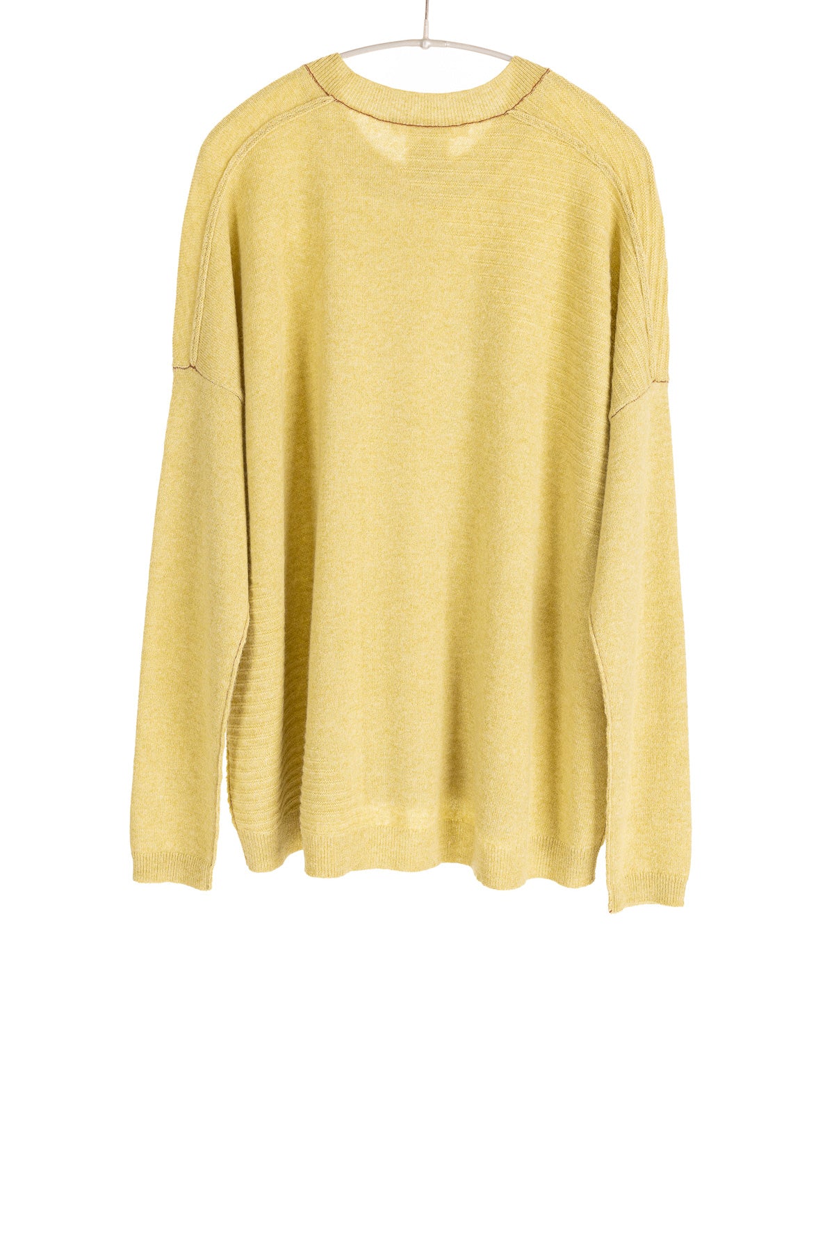 The Textured Pullover features a relaxed fit through the main body and a slimmer fit at the sleeves to balance it. The longer curved back hemline drapes beautifully on body and makes the sweater look beautiful from all angles. The subtle links-links texture, mixed with jersey stitch with ribbed trims, adds surface interest. The pop of color at neckline and the contrast stitching detail at the exposed seam joins add another element of fun to this season’s must-have.