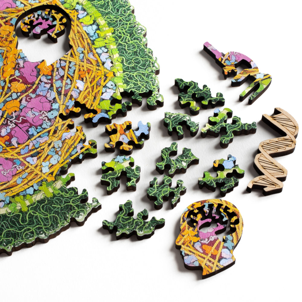 The puzzle contains 3 science themed whimsy pieces: a brain, a microscope and DNA