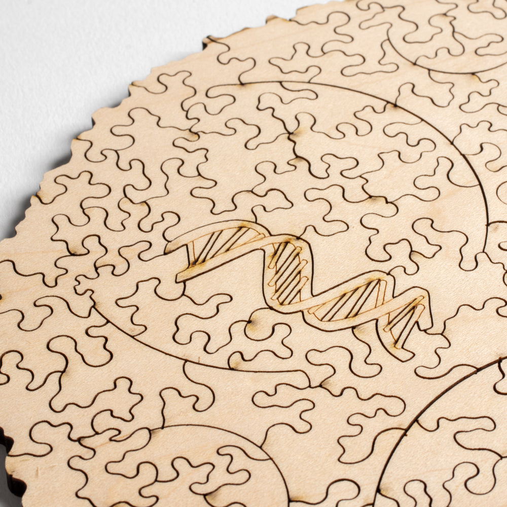 Journey inside one of the simplest living organisms, a Mycoplasma bacterium with this wooden jigsaw puzzle featuring art by scientist David S. Goodsell. This round puzzle has an irregular border and 134 amorphous interlocking pieces. There are also three science themed whimsy pieces and several tricky interior borders within.