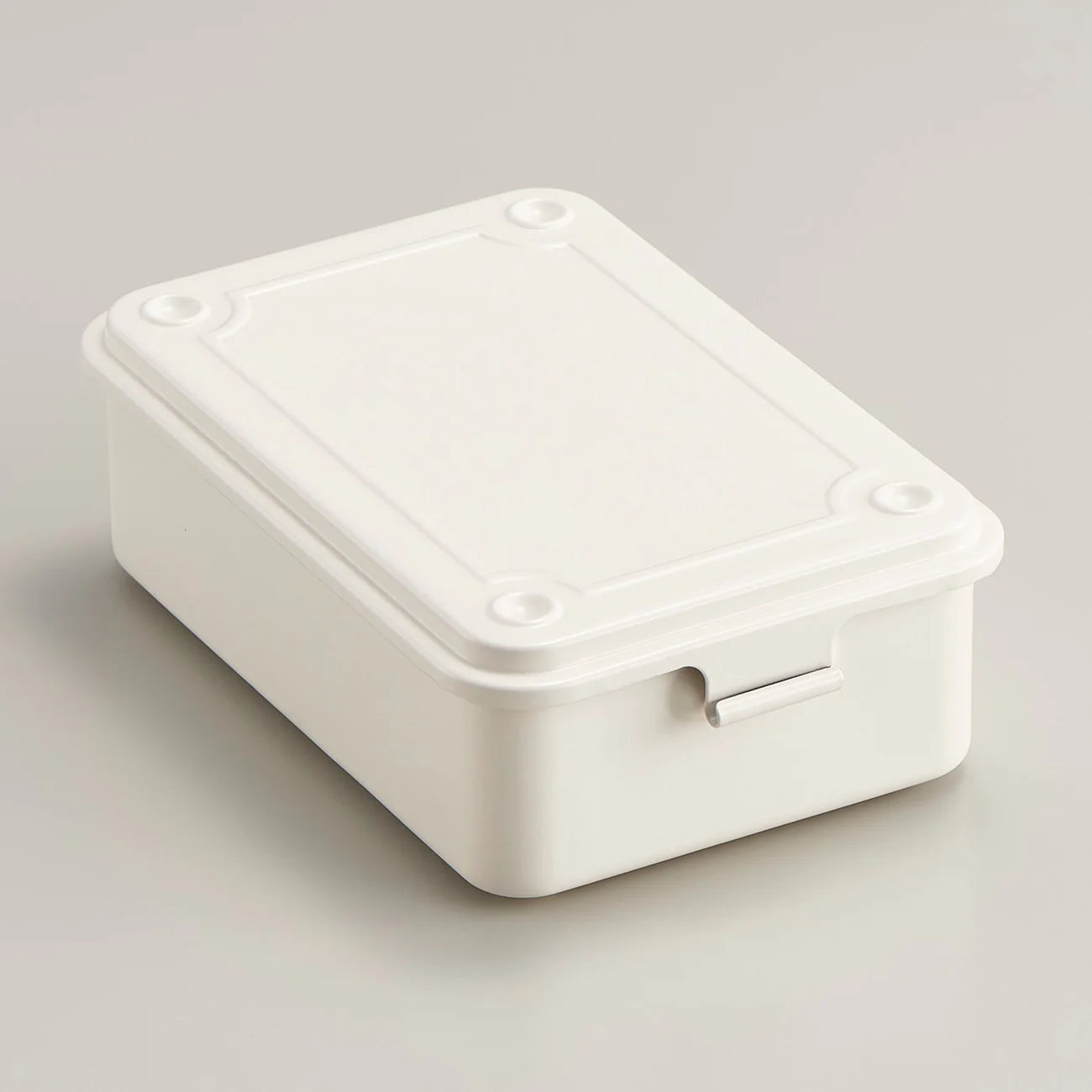 Steel Storage Box with flat lid, made from one piece of steel, resulting in no sharp edges. Can be stacked securely due to the negative / positive imprints on the top and underside.